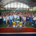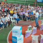 En el coliseo municipal Abraham Bedrán, el viceprefecto Carlos Serrano lideró la entrega de fertilizantes para el cultivo de cacao a 400 pequeños productores de Naranjito.