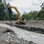 Maquinaria de la entidad trabaja en la reconformación del muro de contención del río Blanco, en el sector Santa Ana- Dos Bocas, recinto El Piedrero, cantón El Triunfo, en el límite provincial.