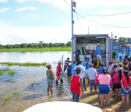 Mientras se avanza en las obras de infraestructura, también se brinda ayuda humanitaria. La tarde del martes, 24 de febrero, 230 familias de La Magdalena recibieron kits de alimentos y bidones de agua potable para que puedan enfrentar las secuelas de los altos niveles de agua que aún mantienen anegadas sus viviendas.