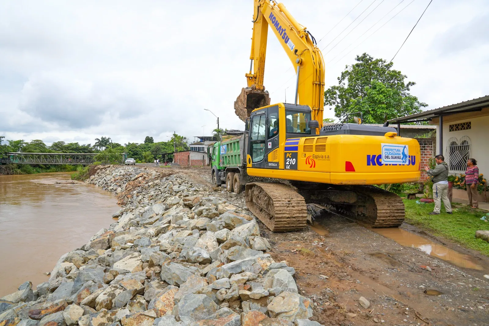 En el sector Las Damas, en Naranjal, maquinaria ingresó para construir un muro de gaviones de 70 metros de longitud y hasta 4,65 metros de alto, para proteger a las casas de la erosión, causada por las lluvias y las crecidas del río Jagua. Varias viviendas quedaron al borde de lo que ahora es un precipicio y han sido abandonadas por moradores como Noemí Villamar. “La Prefectura siempre está ayudándonos. En el momento ahora estamos aliviados”, dijo.