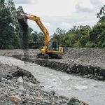En el río Blanco, cantón El Triunfo, se realiza la limpieza del cauce y se reconforma el muro de contención.