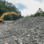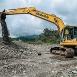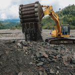 Maquinaria de la entidad trabaja en la reconformación del muro de contención del río Blanco, en el sector Santa Ana- Dos Bocas, recinto El Piedrero, cantón El Triunfo, en el límite provincial.