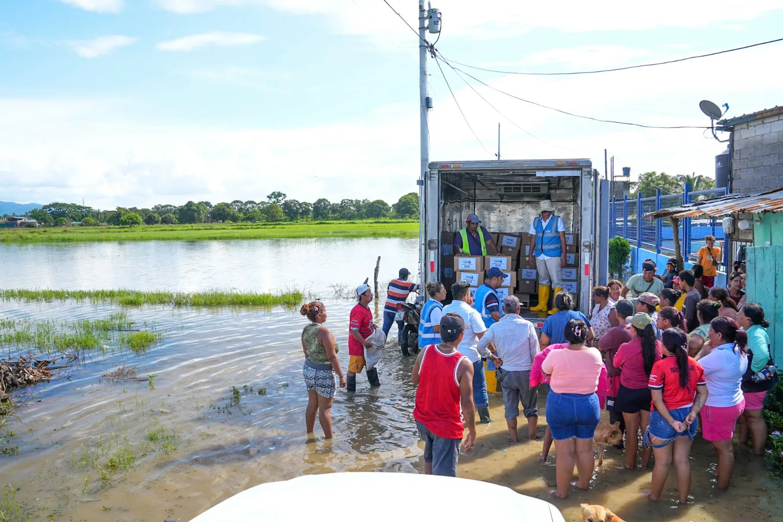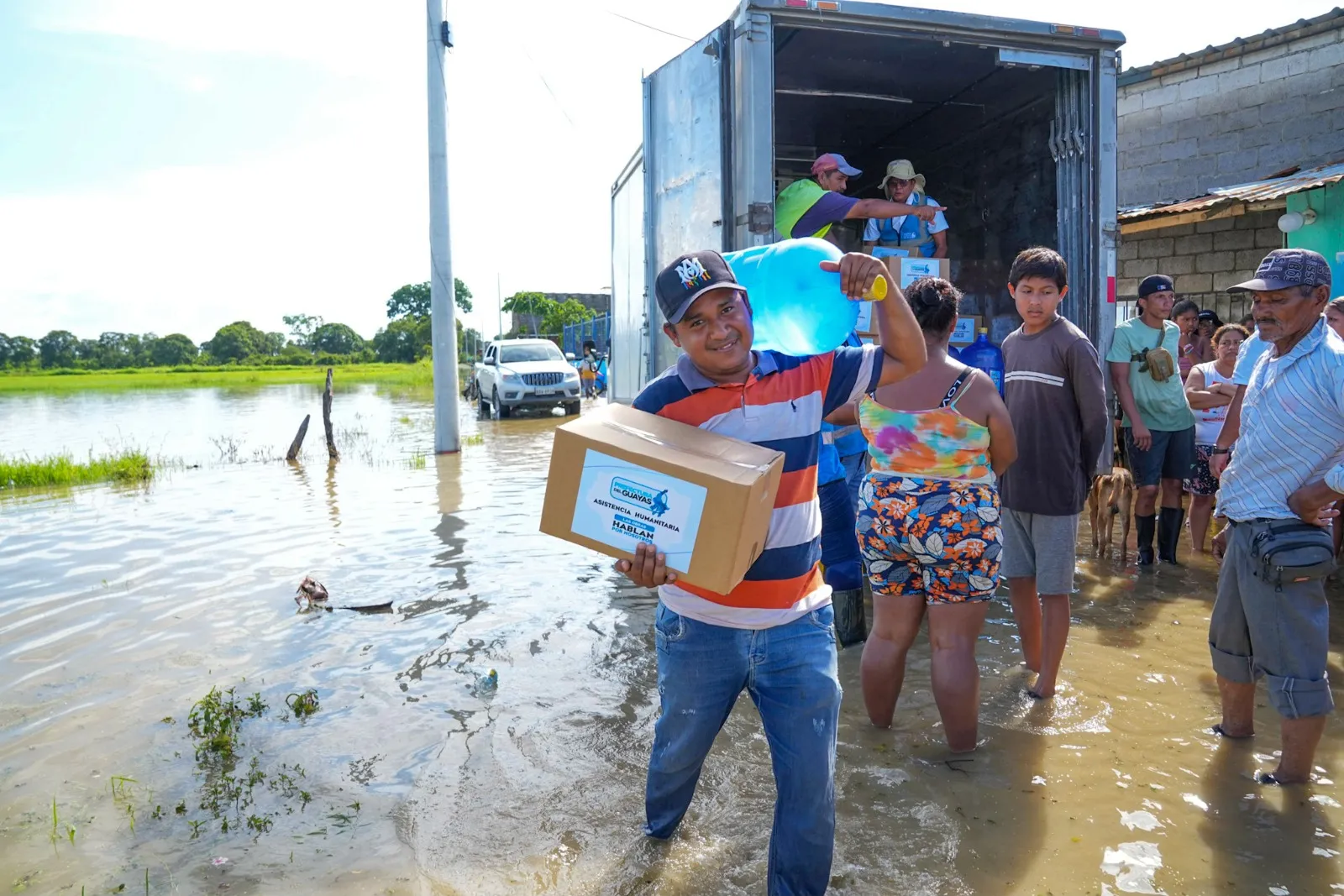Mientras se avanza en las obras de infraestructura, también se brinda ayuda humanitaria. La tarde del martes, 24 de febrero, 230 familias de La Magdalena recibieron kits de alimentos y bidones de agua potable para que puedan enfrentar las secuelas de los altos niveles de agua que aún mantienen anegadas sus viviendas.