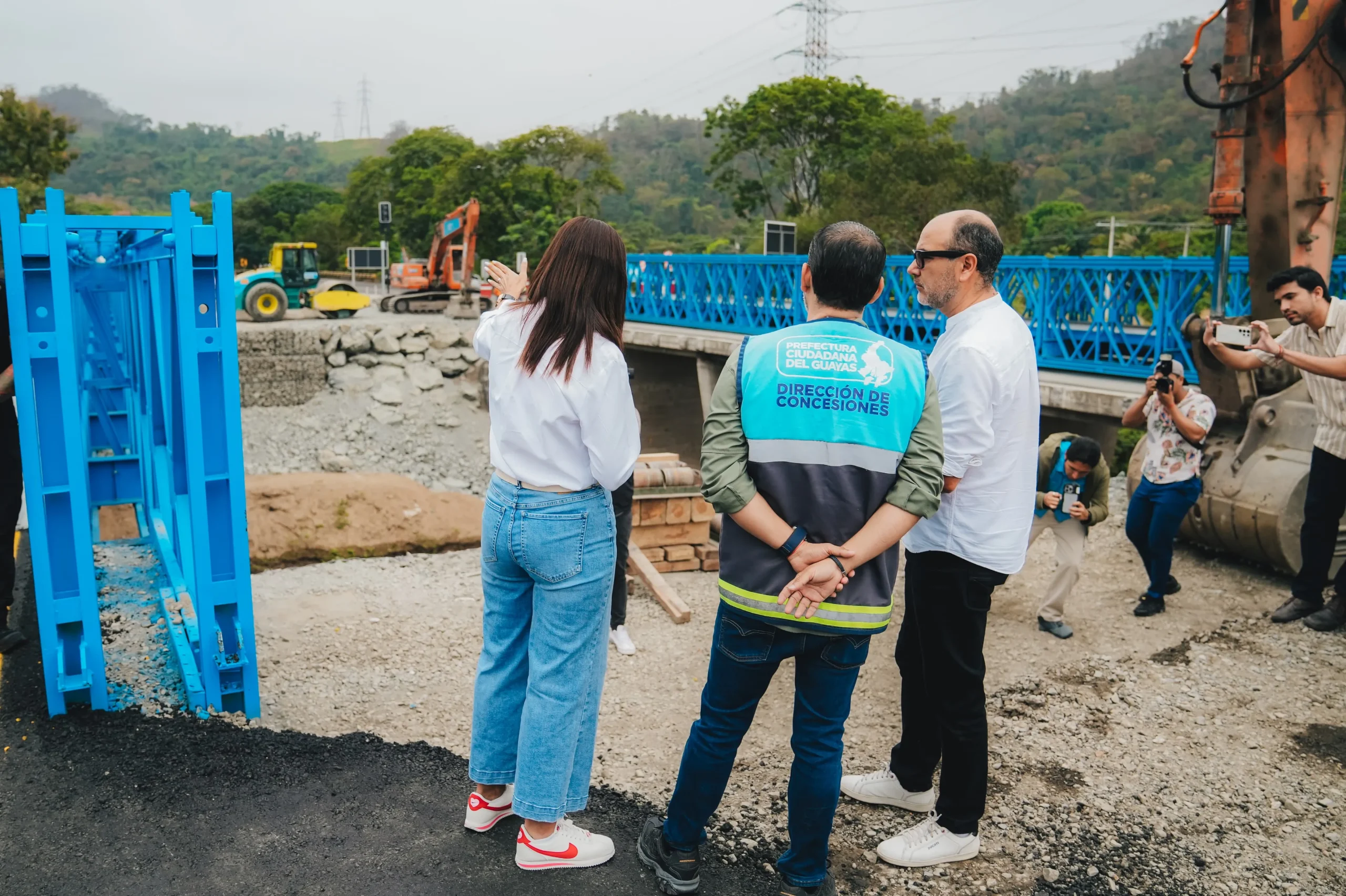 La prefecta Aguiñaga también informó que los pasos provisionales permanecerán operativos hasta la construcción del nuevo puente definitivo de hormigón, cuyos estudios ya registran un 30% de avance. Una vez que concluya este proceso, se programará la demolición de la estructura afectada. “En los próximos días moveremos un puente Bailey pegado al que está ahí. Esperamos que, terminados los estudios, la ejecución del puente nuevo nos tomará, aproximadamente, 12 meses, pero sí vamos a tener que esperar que pase el invierno”, sostuvo ante los medios.