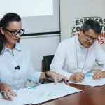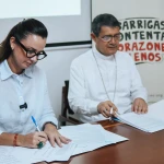 La prefecta del Guayas, Marcela Aguiñaga, y el arzobispo de Guayaquil, monseñor Luis Cabrera, firmaron un convenio de cooperación técnica que permitirá, en los momentos más críticos del Fenómeno de El Niño, atender con ayuda alimenticia inmediata a los damnificados en la provincia.