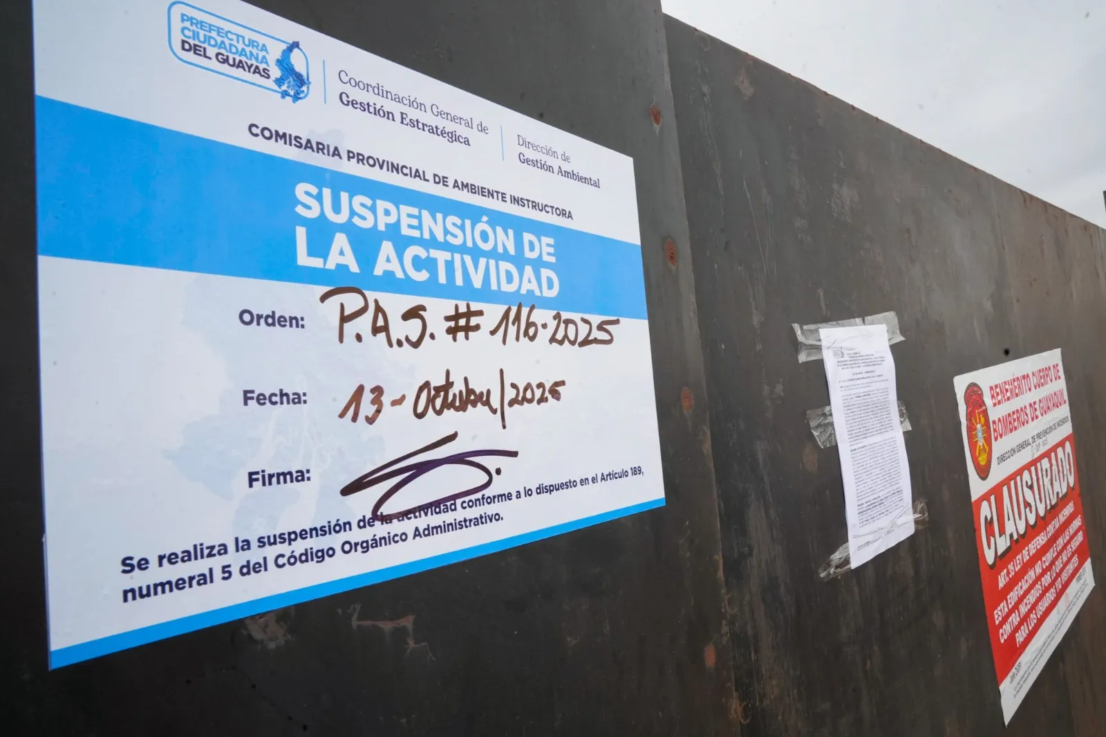 La Prefectura del Guayas, a través de su Comisaría Ambiental, notificó este lunes 13 de octubre el inicio de un proceso administrativo contra el propietario del predio en el que operaba un vertedero clandestino de materiales especiales, donde se registró un incendio forestal. Como producto de la quema de caucho, plásticos, espumas y metales, mezclados con tierra para rellenar el área, hasta el momento, aproximadamente 10 hectáreas presentan afectaciones, en el sector de Casas Viejas, km 22 de la vía a la Costa, en Guayaquil.