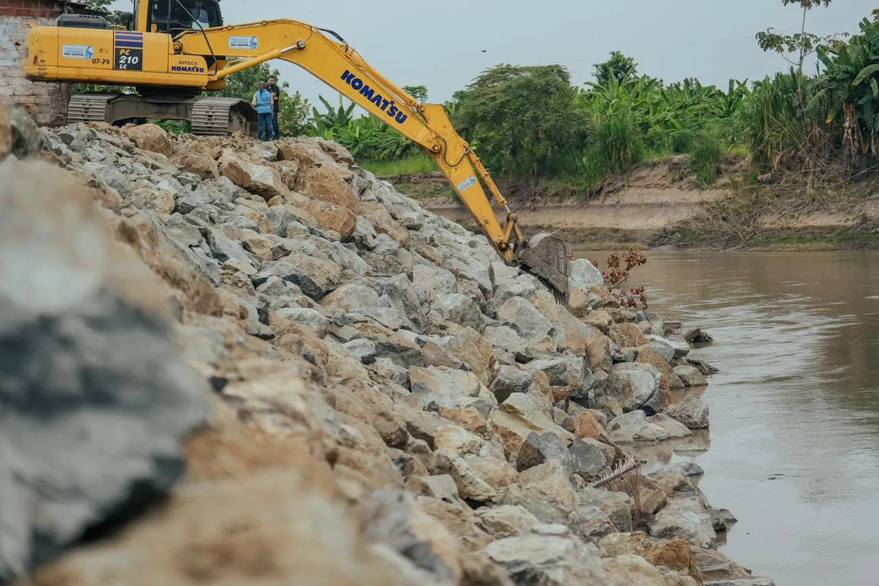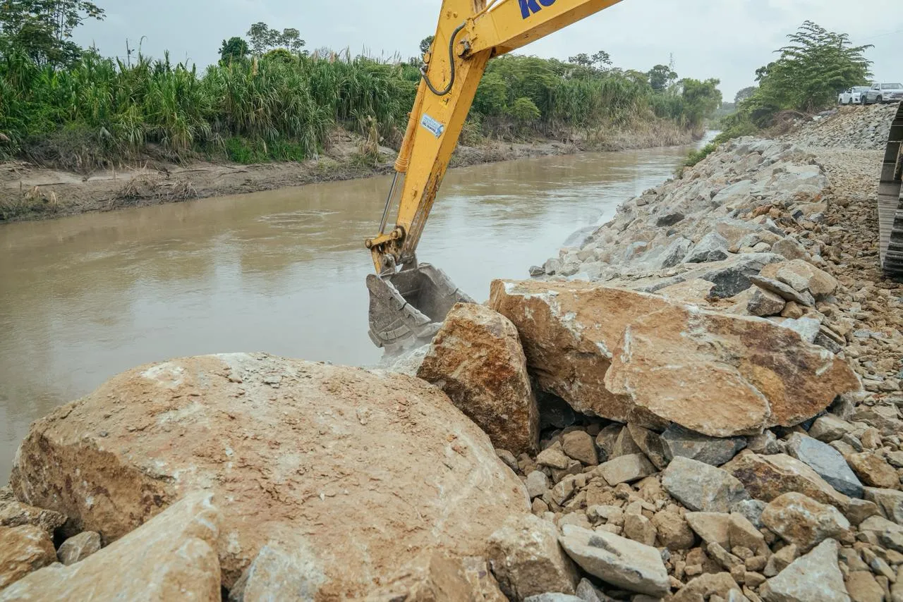 Ante la emergencia, la Prefectura del Guayas realiza trabajos de excavación, relleno con material filtrante y de mejoramiento, así como el reforzamiento con roca para estabilizar la ribera del río Bulu Bulu y prevenir nuevos daños.