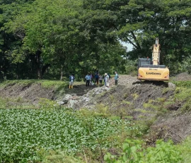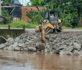 Posteriormente, el recorrido continuó en el sector La Ladrillera, junto al estero Berlín, donde la Prefectura del Guayas ejecuta la reconstrucción y mejoramiento del muro con roca en un tramo de 40 metros, con apoyo de una excavadora y seis volquetas, obra que beneficiará a más de 4.000 habitantes de los sectores cercanos.