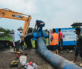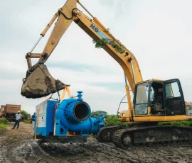 El equipo de la Dirección de Riego, Drenaje y Dragas, estuvo a cargo de la instalación, hasta altas horas de la noche del viernes 28 de febrero. Se trata de una bomba de 20 pulgadas, capaz de evacuar un volumen equivalente a una piscina olímpica por cada hora de funcionamiento. Mediante una manga flexible de alta densidad, el agua acumulada es trasladada hacia el Estero Belín, canal previamente intervenido por la Prefectura, con trabajos de limpieza para garantizar un drenaje masivo y eficiente.