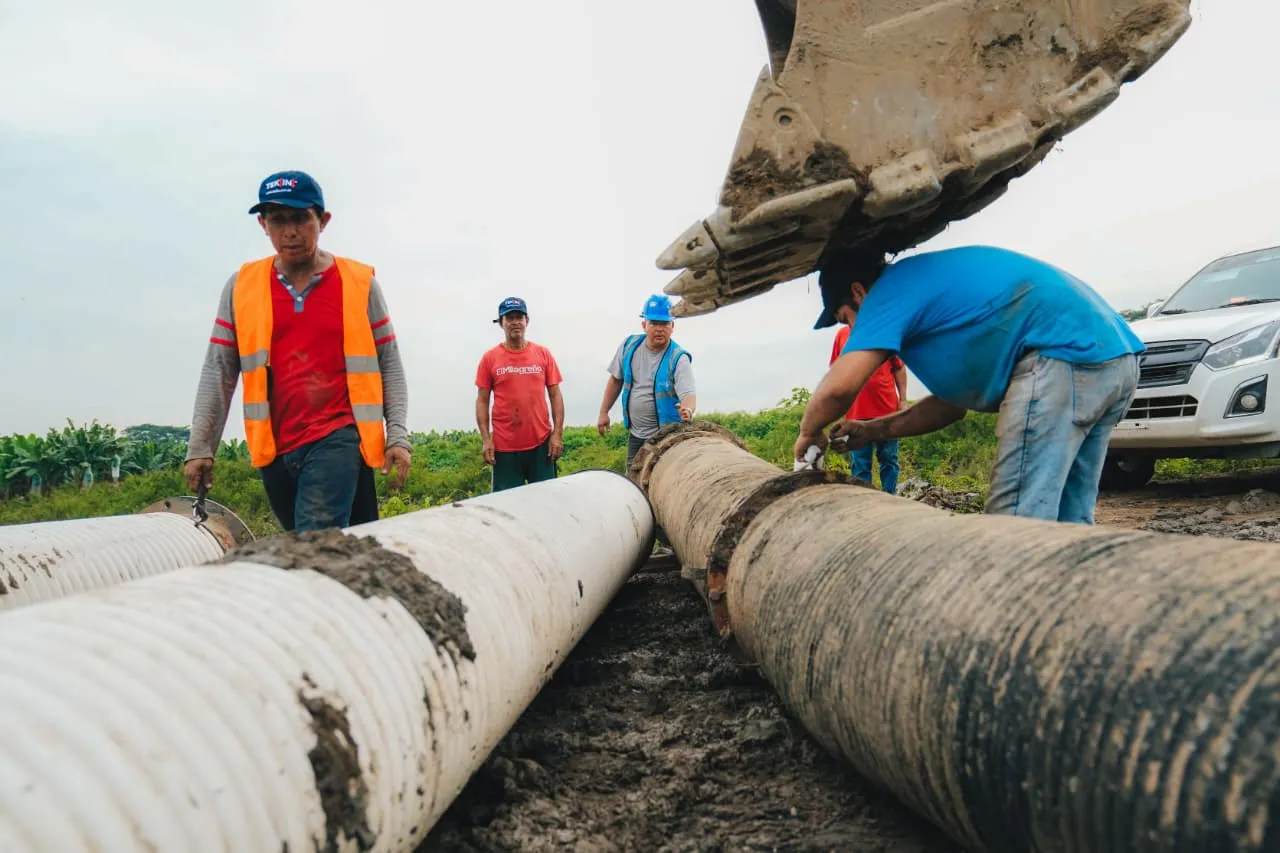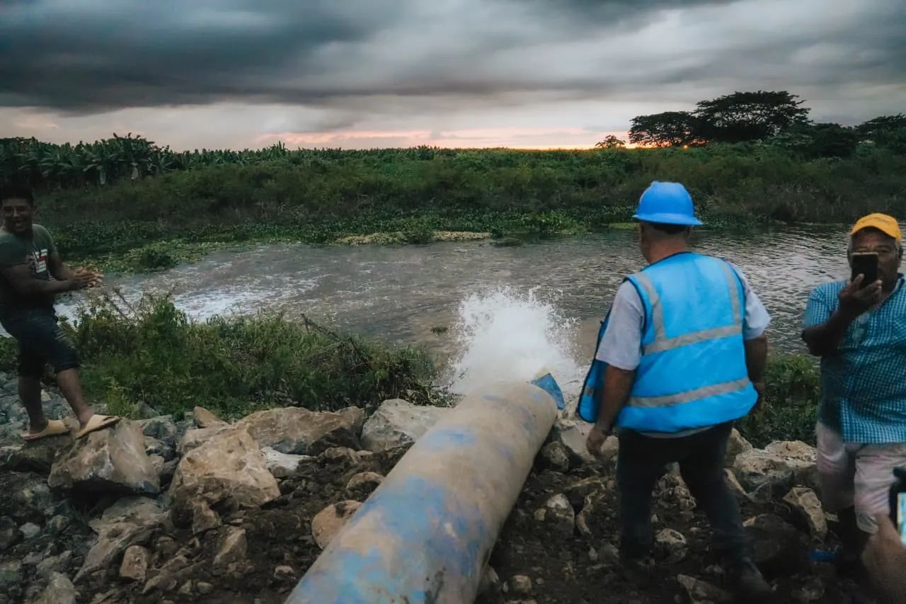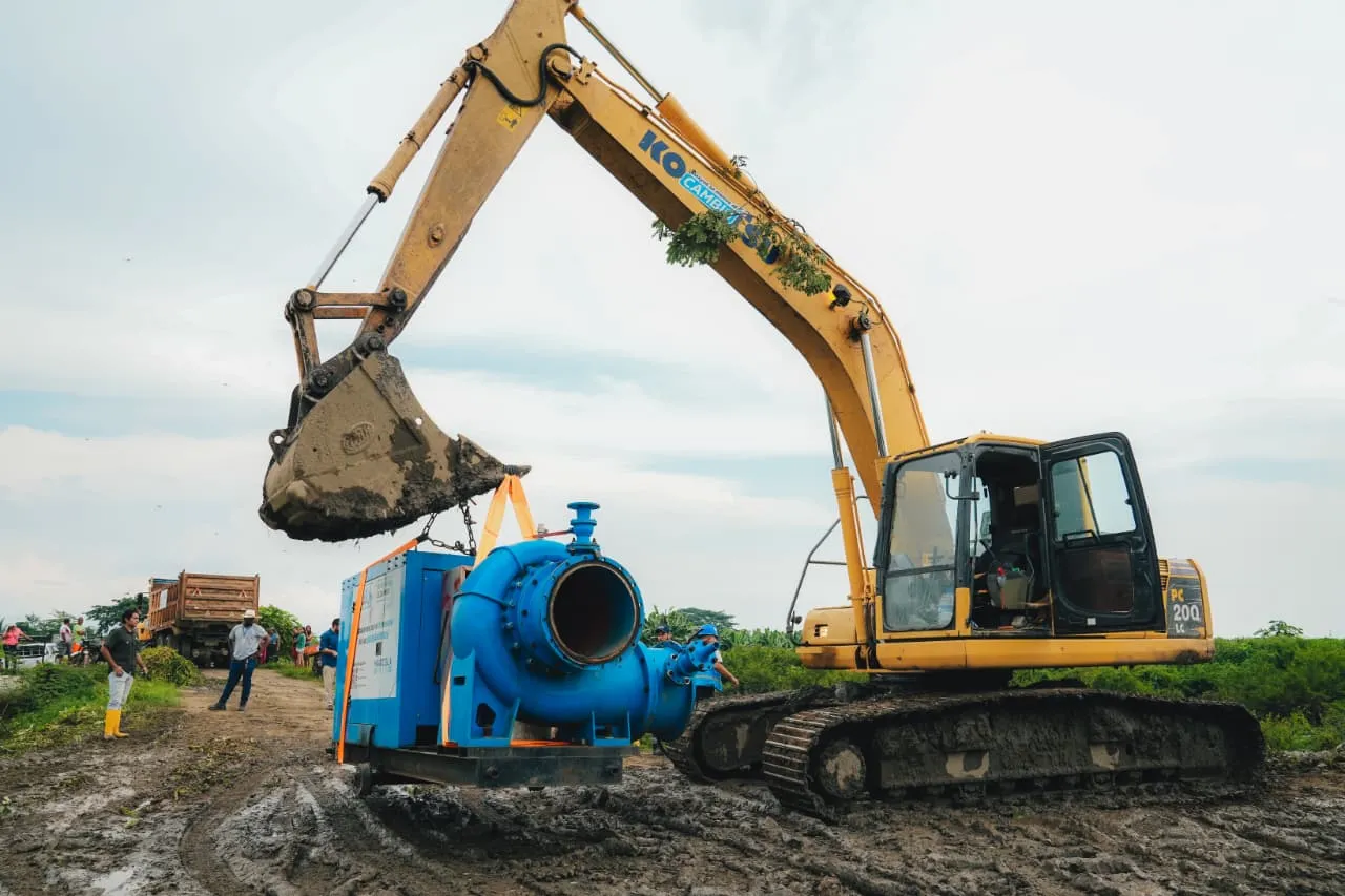 El equipo de la Dirección de Riego, Drenaje y Dragas, estuvo a cargo de la instalación, hasta altas horas de la noche del viernes 28 de febrero. Se trata de una bomba de 20 pulgadas, capaz de evacuar un volumen equivalente a una piscina olímpica por cada hora de funcionamiento. Mediante una manga flexible de alta densidad, el agua acumulada es trasladada hacia el Estero Belín, canal previamente intervenido por la Prefectura, con trabajos de limpieza para garantizar un drenaje masivo y eficiente.