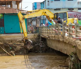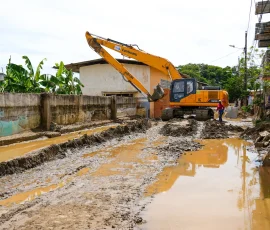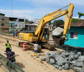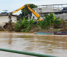 Tras la emergencia reportada en Balao, a causa de fuertes lluvias y el desbordamiento del río, la Prefectura del Guayas mantiene la intervención en territorio con maquinaria pesada y asistencia técnica. Las acciones se intensifican con el propósito de avanzar en la recuperación del cantón y responder ante las necesidades de las familias afectadas. El incremento del caudal del río generó acumulación de sedimentos y palizada en varios sectores de la cabecera cantonal y zonas aledañas, donde se efectúa trabajos de limpieza y remoción de desechos. “Continuamos trabajando en la limpieza de palizada y la remoción de sedimentos que fueron arrastrados por la creciente del río. Desde la noche hasta la madrugada se realizaron estas labores para recuperar las condiciones del cantón”, explicó Patricio Hidalgo, subdirector de Riego, Drenaje y Dragado de la Prefectura del Guayas.