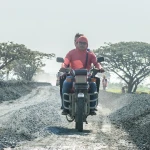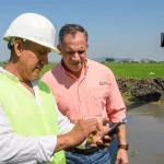 El viceprefecto Serrano también recorrió la obra. El paso por ese camino rural es constante. Los agricultores en sus motos se dirigen a los sembradíos, casi todos de arroz. Otros vehículos transitan retirando la producción local.