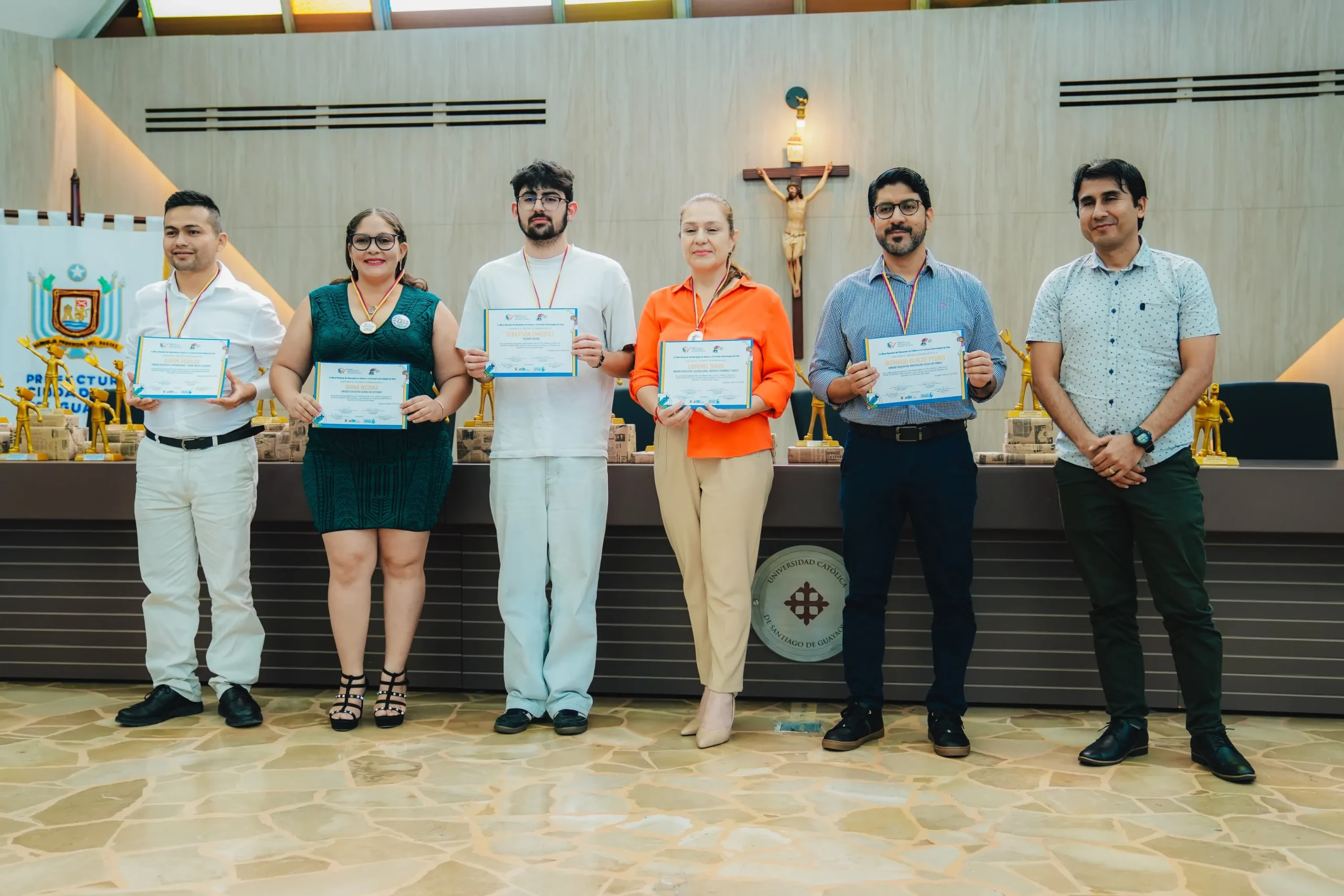 La premiación se dio este sábado, 15 de febrero, en el Aula Magna de la Universidad Católica de Santiago de Guayaquil, en el marco del FIC. Contó con la presencia de la prefecta Marcela Aguiñaga; la coordinadora de la Mesa, Anunziatta Valdez; el codirector del FIC, Ramón Murillo; y, participantes de las 51 producciones en concurso.